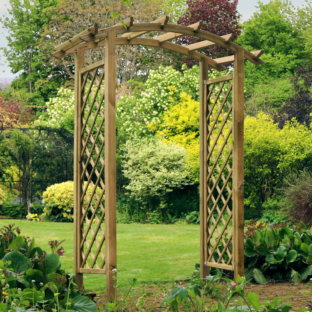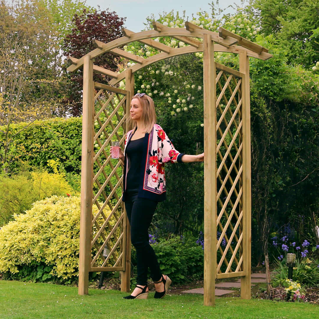 The curved rafter of the Daria Arch adds elegance to any garden. The diamond trellis side panels offer ample space for climbing plants, as well as looking attractive. The 1.80m adjustable width can suit any garden walkway or entrance. Made from pressure treated wood with a 10-year guarantee against rot.